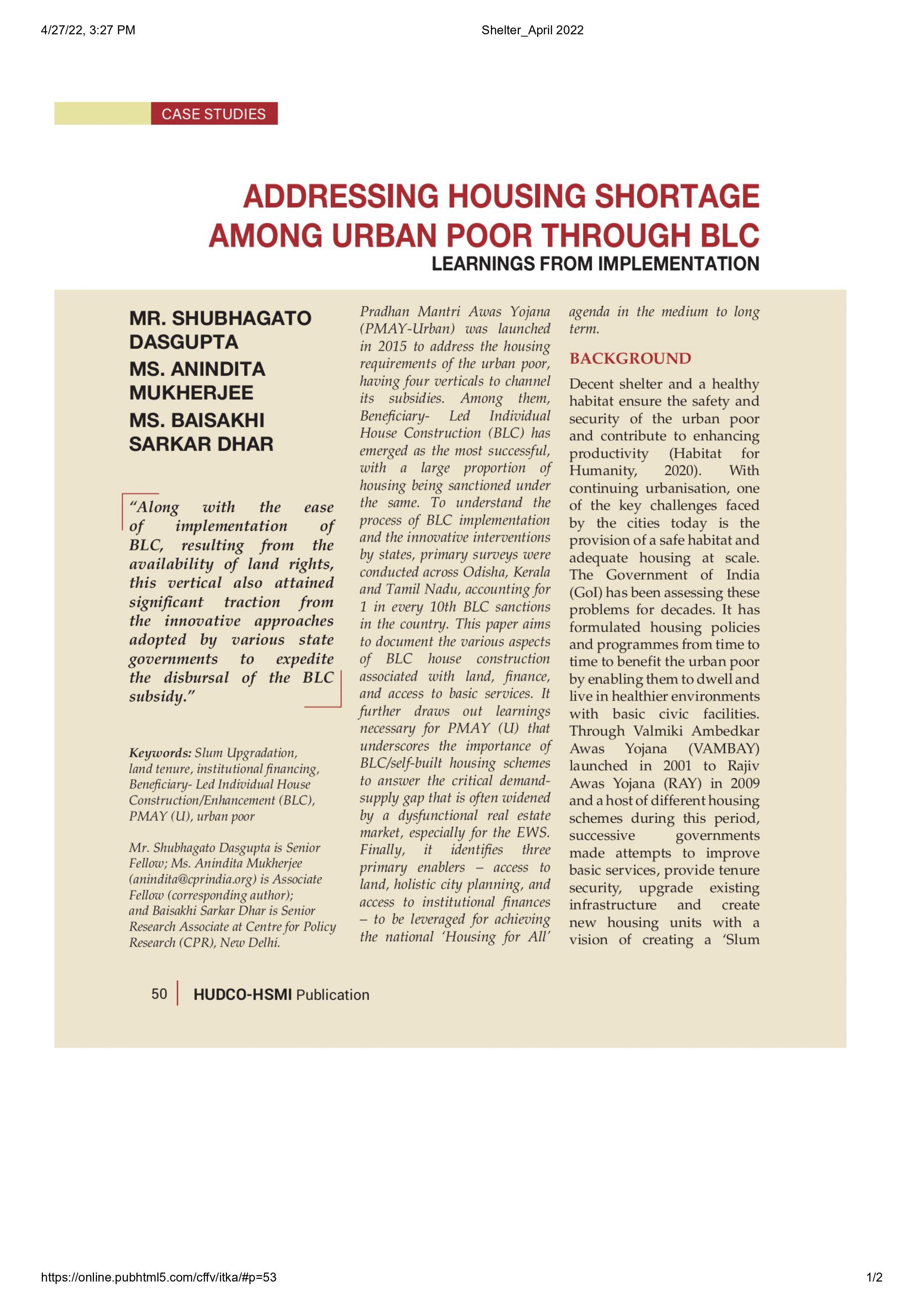 Addressing Housing Shortage Among Urban Poor Through BLC: Learnings from Implementation